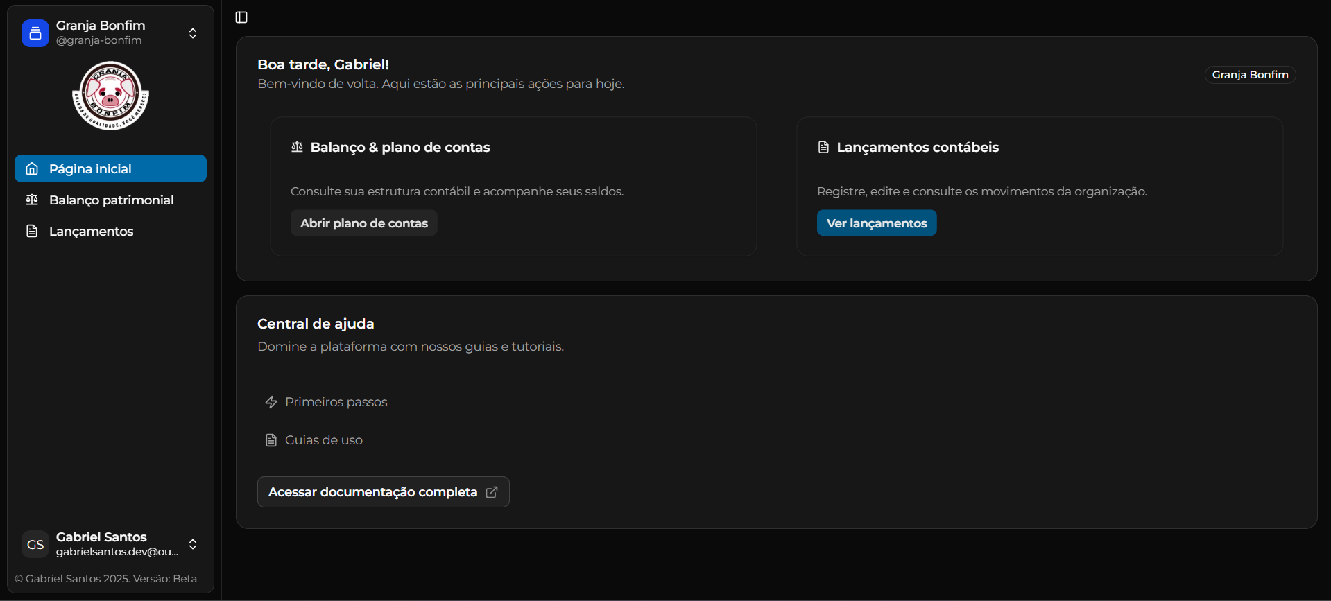O menu lateral é o principal meio de navegação do sistema. Ele concentra o acesso às principais funcionaidades, módulos do sistema e configurações de conta.